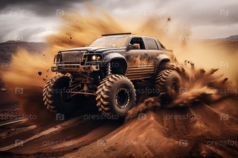 Чудовищный грузовик едет на открытом воздухе среди облака пыли - волнение и адреналин открытого внедорожного гоночного мероприятия