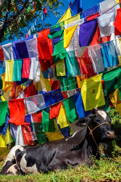 Корова под буддийскими молитвенными флагами на коре вокруг комплекса Цуглаганг.Маклеод Гандж, Химачал-Прадеш, Индия