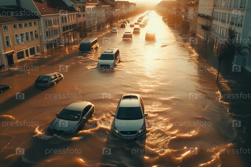 Концепция фона катастрофы - автомобили на затопленной улице европейского города
