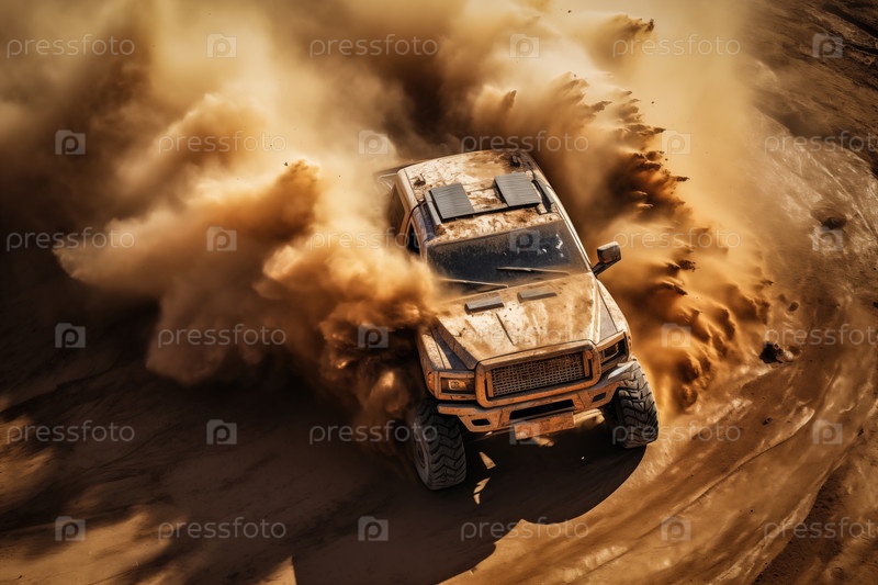 Динамический взгляд с воздуха на грузовик-монстр с большими шинами, прокладывающий путь в бездорожье через шероховатую местность, поднимая пыль и мусор