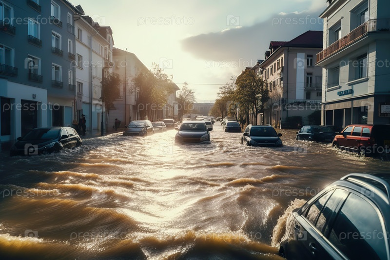 Концепция фона катастрофы - автомобили на затопленной улице европейского города