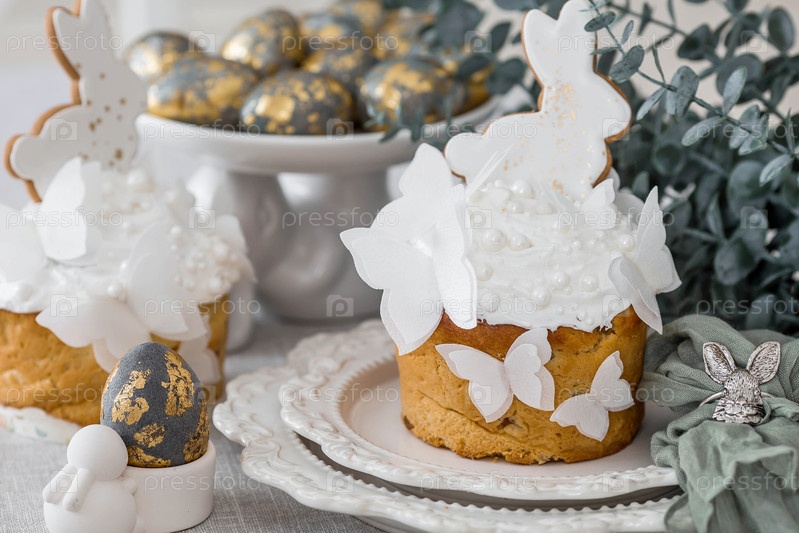 Пасхальные угощения и еда.Счастливого Пасхи 2026.Пасхальный торт с белыми кроликами из пряничного хлеба, бабочками из рисовой бумаги, позолоченными пасхальными яйцами и ветвями эвкалипта на светлом фоне