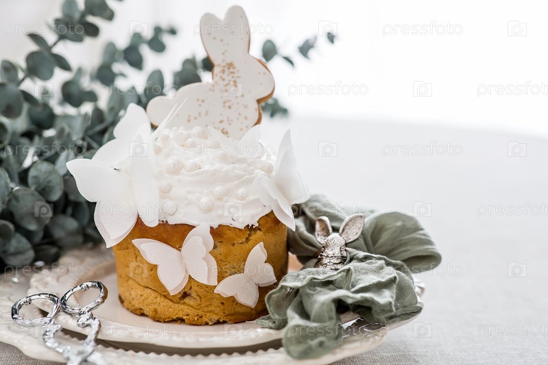 Пасхальные угощения и еда.Счастливого Пасхи 2026.Пасхальный торт с белыми кроликами из пряничного хлеба, бабочками из рисовой бумаги, позолоченными пасхальными яйцами и ветвями эвкалипта на светлом фоне