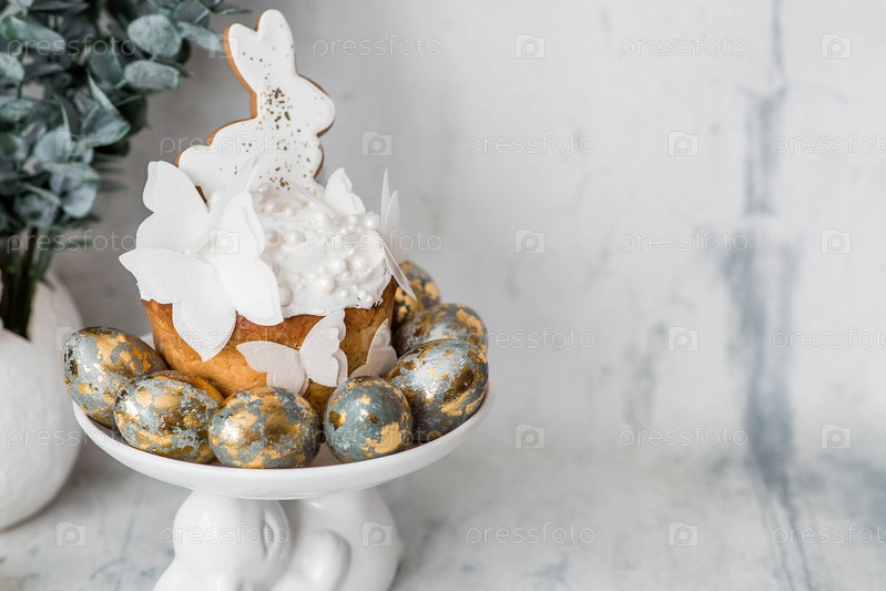 Пасхальные угощения и еда.Счастливого Пасхи 2026.Пасхальный торт с белыми кроликами из пряничного хлеба, бабочками из рисовой бумаги, позолоченными пасхальными яйцами и ветвями эвкалипта на светлом фоне
