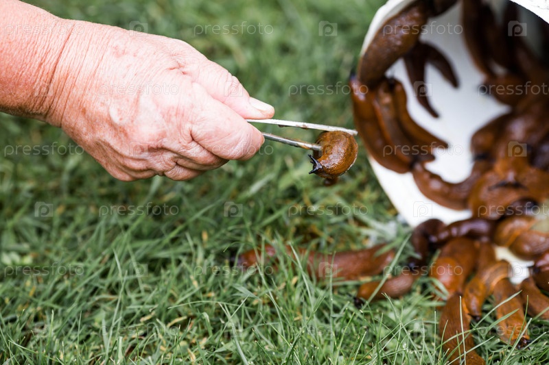 Дизайн испанского слизняка Arion lusitanicus находится в руках садовника. По саду ползут скользкие коричневые улитки. Их загрязнение повреждает листья и культуры. Коллекция инвазивных видов