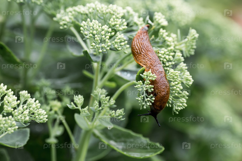 Большие слизистые коричневые улитки ползут по саду Инфекция слизью повреждает листья и культуры Коллекция инвазивных видов