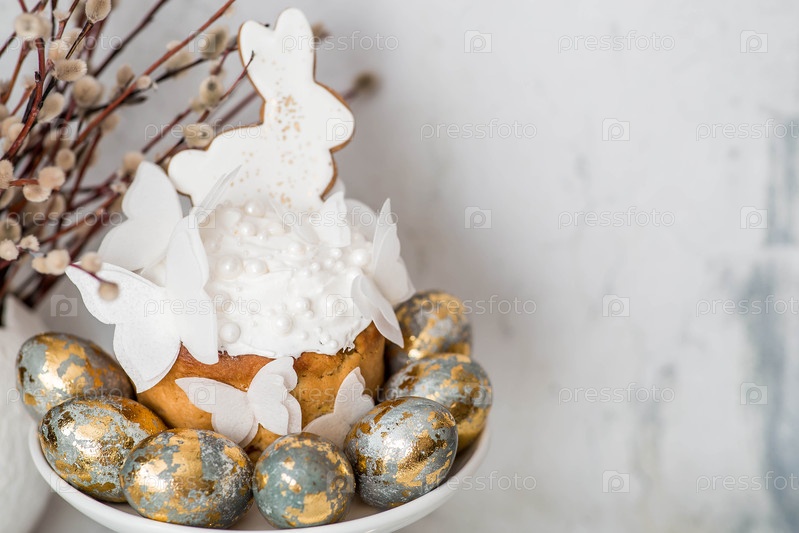 Пасхальные угощения и еда.Счастливого Пасхи 2026.Пасхальный торт с белыми кроликами из пряничного хлеба, бабочками из рисовой бумаги и пасхальными яйцами со златоватыми ветвями и вербовками на светлом фоне