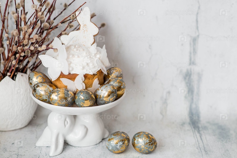 Пасхальные угощения и еда.Счастливого Пасхи 2026.Пасхальный торт с белыми кроликами из пряничного хлеба, бабочками из рисовой бумаги и пасхальными яйцами со златоватыми ветвями и вербовками на светлом фоне