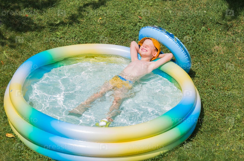 Сегодня жаркий день. Милый мальчик плавает в бассейне. Счастливый парень улыбается камере. Концепция летних отпусков с детьми