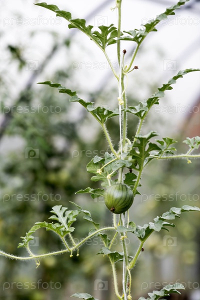 Выращивание арбузов в теплице. пушки, зеленые листья и небольшой арбуз. садоводство и сбор урожая для здорового питания
