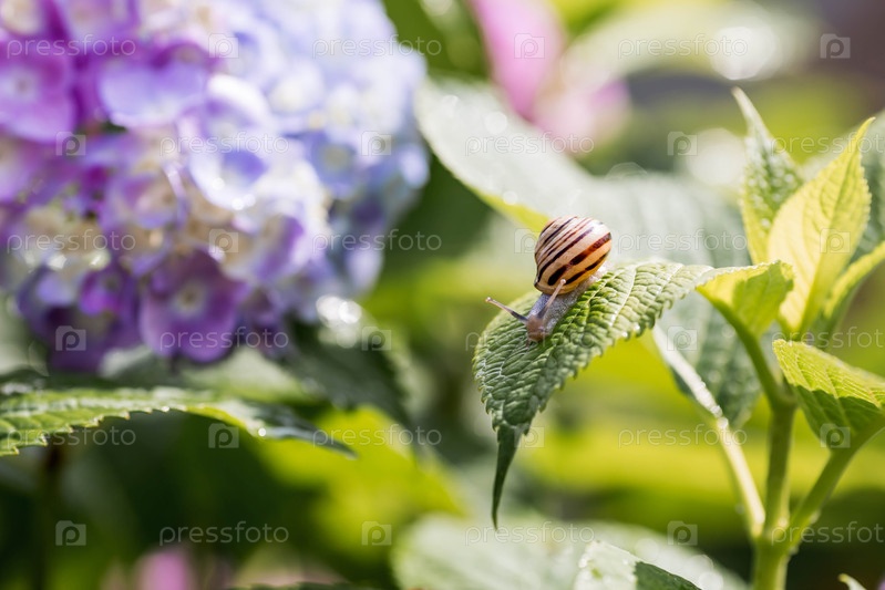 Садовый вредитель. виноградный улитка (Helix pomatia) на цветущей гортензии. съедобная улитка. земной моллюск-гастропод семейства Helicidae