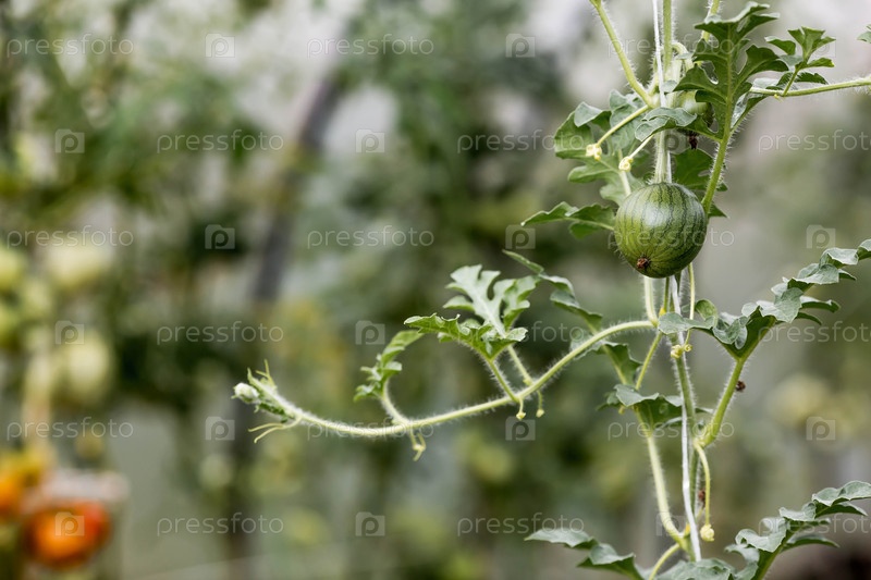 Выращивание арбузов в теплице. пушки, зеленые листья и небольшой арбуз. садоводство и сбор урожая для здорового питания