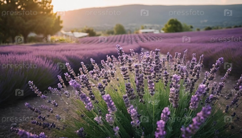 Яркие цветы лаванды мягко колеблются в летнем ветре, заполняя теплый вечерний воздух опьяняющим ароматом, когда солнце садится за отдаленными холмами