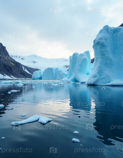 Блестящие ледовые образования грациозно дрейфуют по спокойным океанским водам, окруженные потрясающими горными вершинами и безмятежным облачным небом