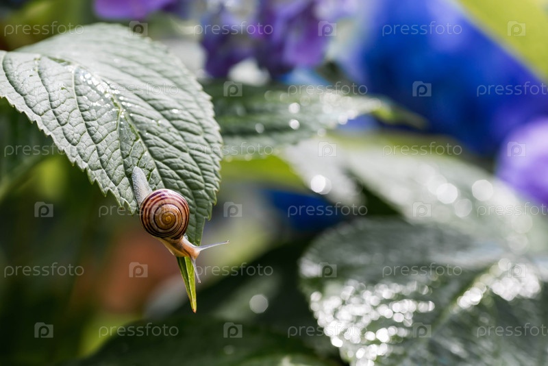 Садовый вредитель. виноградный улитка (Helix pomatia) на цветущей гортензии. съедобная улитка. земной моллюск-гастропод семейства Helicidae