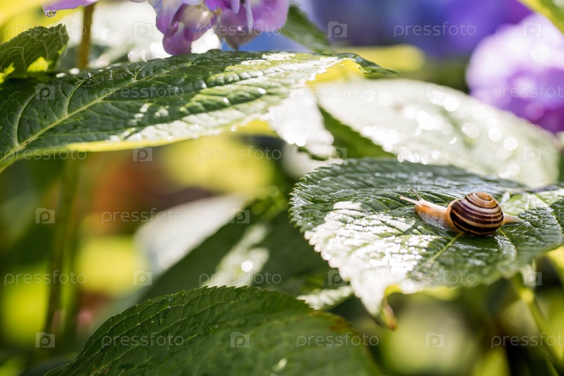 Садовый вредитель. виноградный улитка (Helix pomatia) на цветущей гортензии. съедобная улитка. земной моллюск-гастропод семейства Helicidae