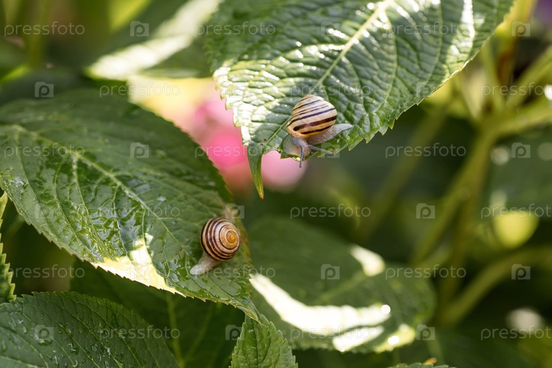 Садовый вредитель. виноградный улитка (Helix pomatia) на цветущей гортензии. съедобная улитка. земной моллюск-гастропод семейства Helicidae