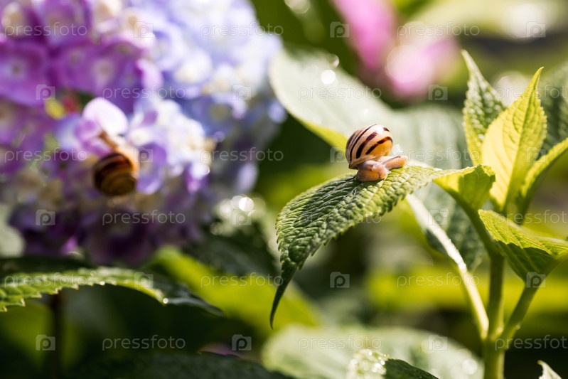 Садовый вредитель. виноградный улитка (Helix pomatia) на цветущей гортензии. съедобная улитка. земной моллюск-гастропод семейства Helicidae