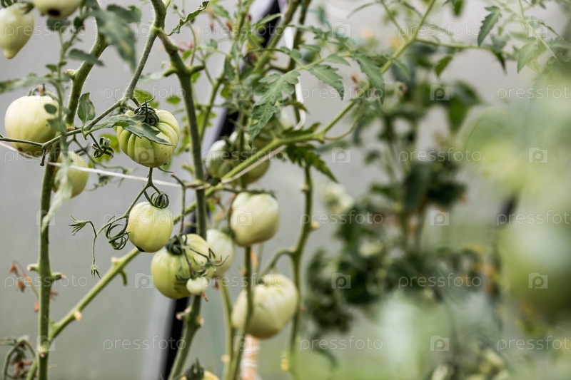 Саженцы томатов выращиваются в земле на поднятых кроватях в теплице. зеленые помидоры на ветвях. Концепция созревания и сельского хозяйства помидоров