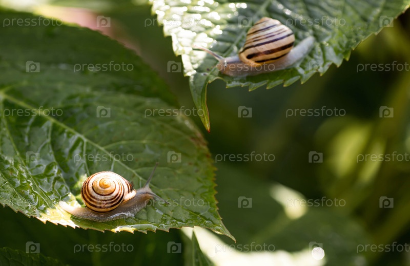 Садовый вредитель. виноградный улитка (Helix pomatia) на цветущей гортензии. съедобная улитка. земной моллюск-гастропод семейства Helicidae