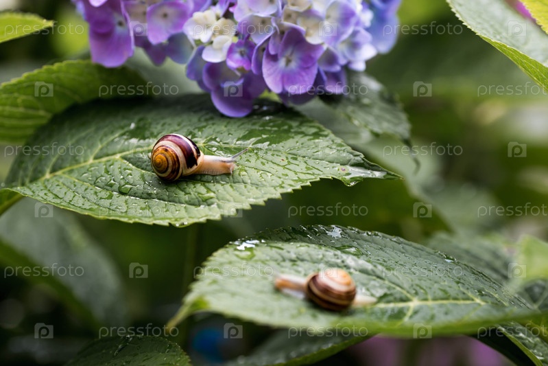 Садовый вредитель. виноградный улитка (Helix pomatia) на цветущей гортензии. съедобная улитка. земной моллюск-гастропод семейства Helicidae