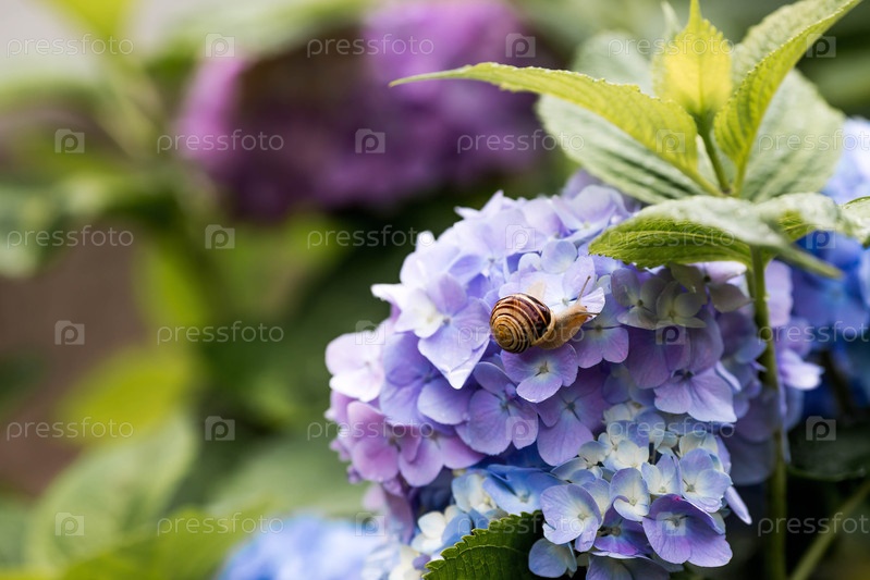 Садовый вредитель. виноградный улитка (Helix pomatia) на цветущей гортензии. съедобная улитка. земной моллюск-гастропод семейства Helicidae