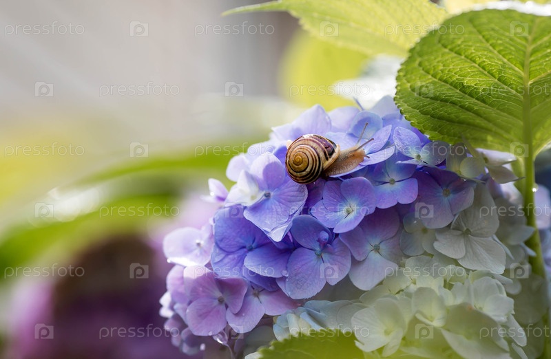 Садовый вредитель. виноградный улитка (Helix pomatia) на цветущей гортензии. съедобная улитка. земной моллюск-гастропод семейства Helicidae