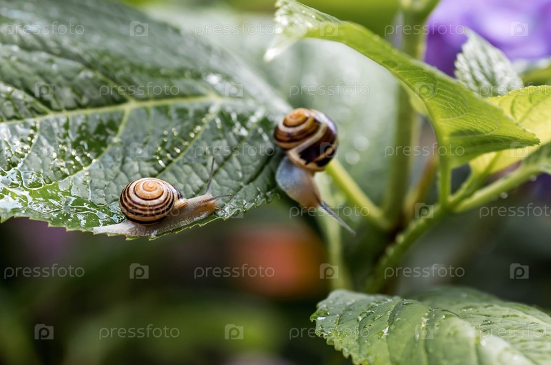 Садовый вредитель. виноградный улитка (Helix pomatia) на цветущей гортензии. съедобная улитка. земной моллюск-гастропод семейства Helicidae