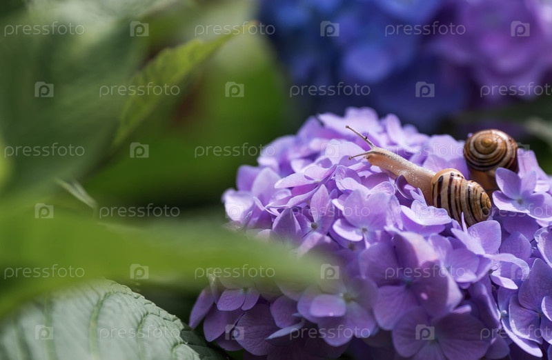 Садовый вредитель. виноградный улитка (Helix pomatia) на цветущей гортензии. съедобная улитка. земной моллюск-гастропод семейства Helicidae