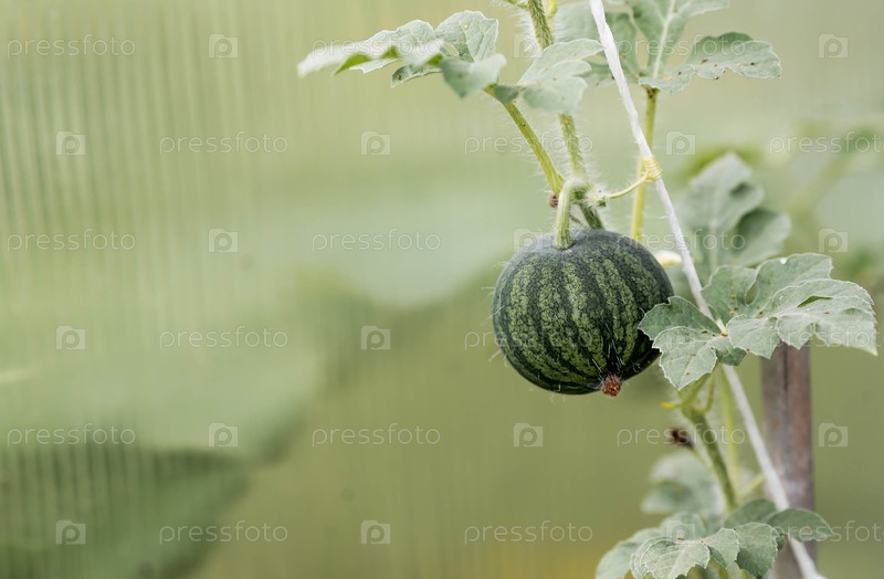 Выращивание арбузов в теплице. пушки, зеленые листья и небольшой арбуз. садоводство и сбор урожая для здорового питания