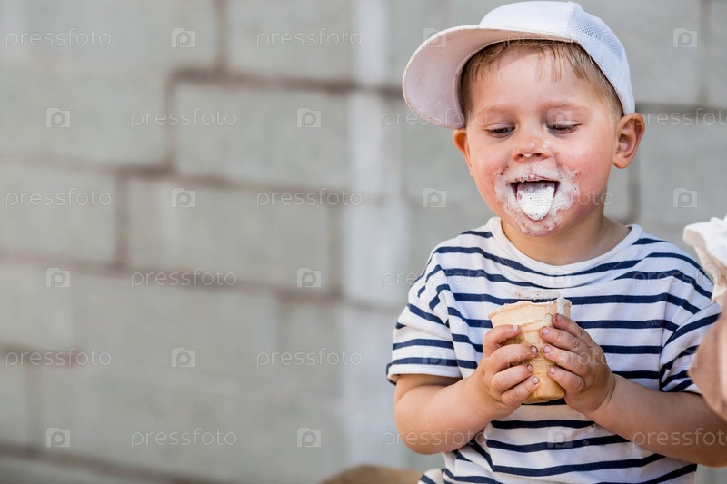 Забавный, эмоциональный и счастливый мальчик с грязным лицом ест мороженое в жаркий летний день