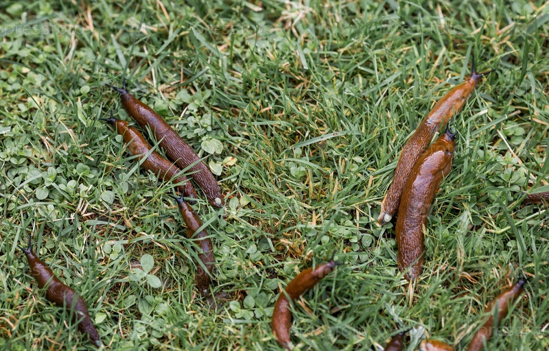 Большие слизистые коричневые улитки ползут по саду Инфекция слизью повреждает листья и культуры Коллекция инвазивных видов