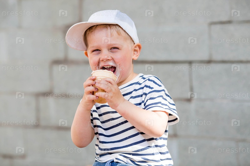 Забавный, эмоциональный и счастливый мальчик с грязным лицом ест мороженое в жаркий летний день