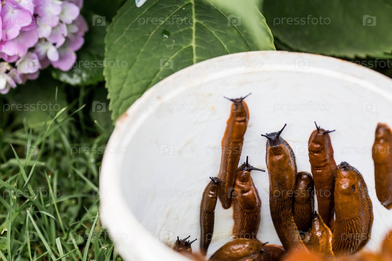 Большие слизистые коричневые улитки ползут по саду Инфекция слизью повреждает листья и культуры Коллекция инвазивных видов
