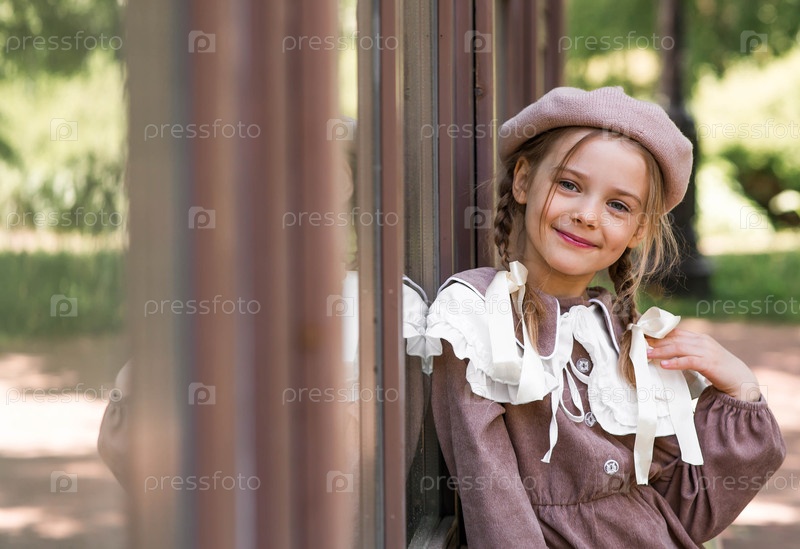 Маленькая красивая девушка с луками в волосах, в бежевом платье и берете на улице. винтажные женские аксессуары и одежда в ретро стиле