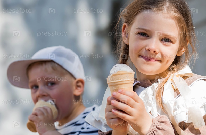 Маленькая девочка и мальчик едят мороженое в жаркий летний день