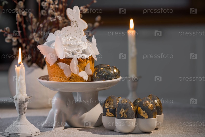 Пасхальная еда.Счастливая Пасха 2026.Пасхальный торт с белыми зайцами из пряничного хлеба, бабочками из рисовой бумаги, позолоченными пасхальными яйцами, свечами и ветвями ивы на светлом фоне