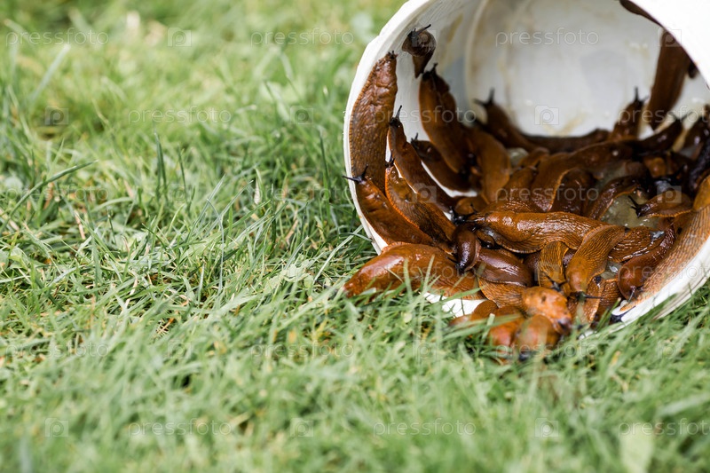 Большие слизистые коричневые улитки ползут по саду Инфекция слизью повреждает листья и культуры Коллекция инвазивных видов
