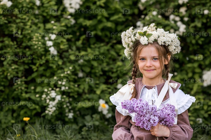 Красивая девочка с луками в волосах, одетая в бежевое платье и лиловые цветы на улице