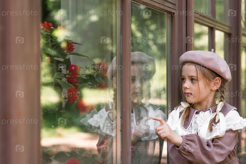 Винтажные женские аксессуары и одежда в ретро-стиле.Маленькая красивая девушка с луками на волосах, в бежевом платье и берете на открытом воздухе