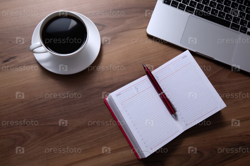 Чашка кофе, ноутбук и дневник с ручкой на рабочем столе