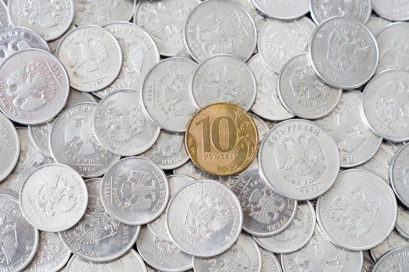 Монета в десять рублей - золотой акцент среди серебряных монет лежащего орла