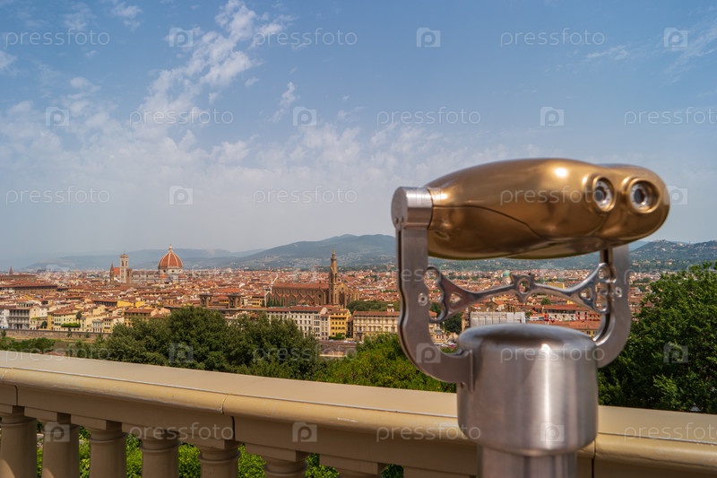 Флоренция, Италия.Панорамный вид на Флоренцию с смотровой площадки с биноклями в переднем плане.Городской пейзаж со Собором Святой Марии Цветом
