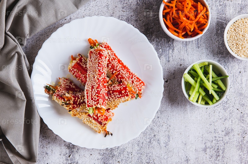 Огурцы и корейские морковь, завернутые в крабное мясо и жарены с сусамообразными верхними тарелками