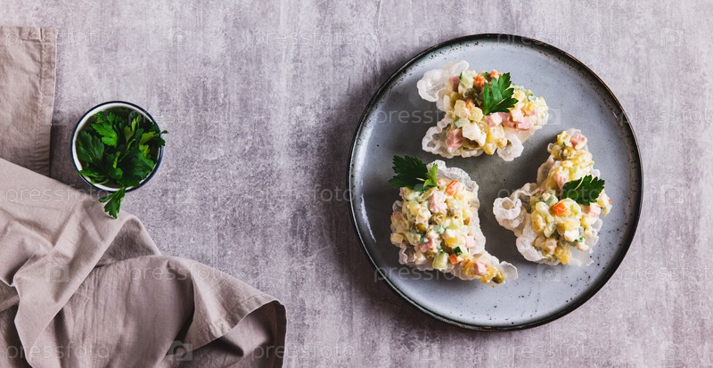 Оливковый салат в рисовых бумажных мисках на тарелке на столе с просмотром веб-баннера
