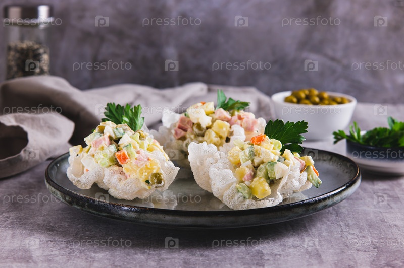 Частичный салат Оливье творчески подается на тарелке за столом