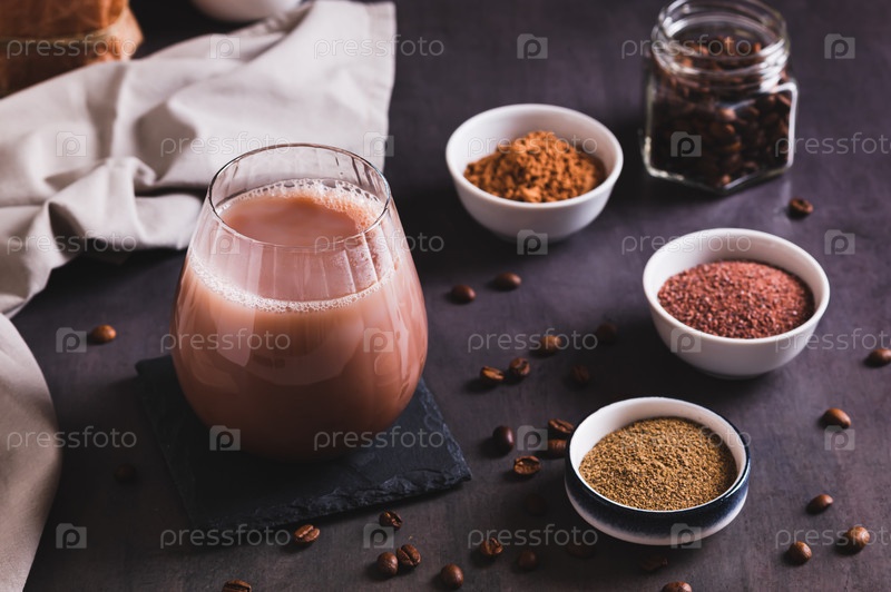 Кофе со специями и какао-порошок в стакане на столе