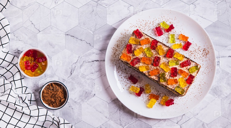Сладкое тирамису с переваривающимися медведями на тарелке на столе with web banner view
