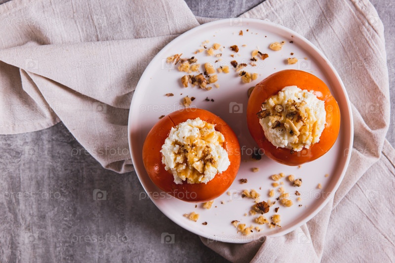Закрытие спелого персимона, наполненного творогом, медом и орехами в верхней части тарелки