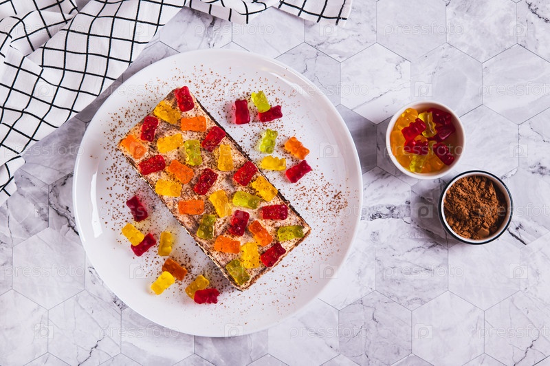 Шоколадный торт, украшенный переваривающимися медведями на тарелке с видом на стол